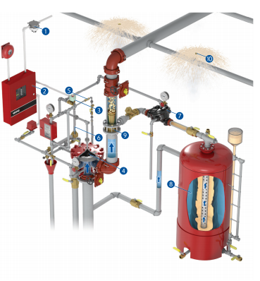 Dedektör (1) yangınla devreye girdiğinde, Yangın Algılama Kontrol Paneline (2) bir sinyal gönderilir. Panel uygun alarm sinyallerini gönderir ve aynı zamanda selenoid valfin açılmasını sağlar (3). Baskın vanası başlatma hücresi (4) kısıtlayıcı orifisten beslenen sudan (5) daha hızlı boşaltılırak baskın vananın açılması sağlanır. Baskın vana çalıştığında, sistemde oluşan basınç, basınçla çalışan tahliye valfini açar (PORV) (6), devamlı olarak suyu başlatma hücresinden tahliye eder, baskın vananın açık konumda kalmasını sağlar. Halar kaplamalı konsantre kontrol vanasına (7) bağlı aksamın boru tesisatı, köpük konsantre vanasının yaklaşık olarak aynı zamanda açılmasını sağlayarak, köpük konsantresi hattını sprinkler sitemine açar. Sistem suyu tarafından basınçlandırılan diyaframlı köpük tankının, tank ve diyafram arasındaki dış çeper (8), köpük konsantresini sıkarak oranlayıcıdan (9) sprinkler sitemine gönderir. Su, oranlayıcının ventüri alanından akarken, hesaplanmış oranda bir köpük solüsyonu oluşur. Ardından bu solüsyon sprinkler boru tesisatından akarak açık sprinklerden veya nozullardan boşalır (10).